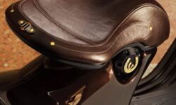 La sella è realizzata in vera pelle, con cuciture a contrasto e finiture artigianali che raccontano il valore del “fatto a mano”. Il manubrio, le staffe degli specchi e i rivetti dorati completano un insieme che unisce prestigio e carattere.