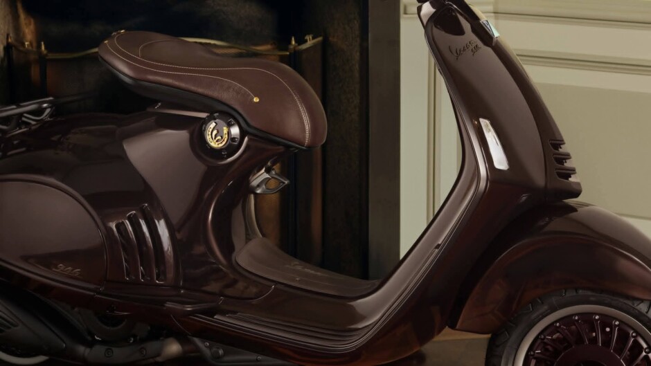 Sotto la sella, come sigillo distintivo, trovi la “V” Vespa racchiusa in un ferro di cavallo dorato: simbolo di protezione, fortuna e identità.