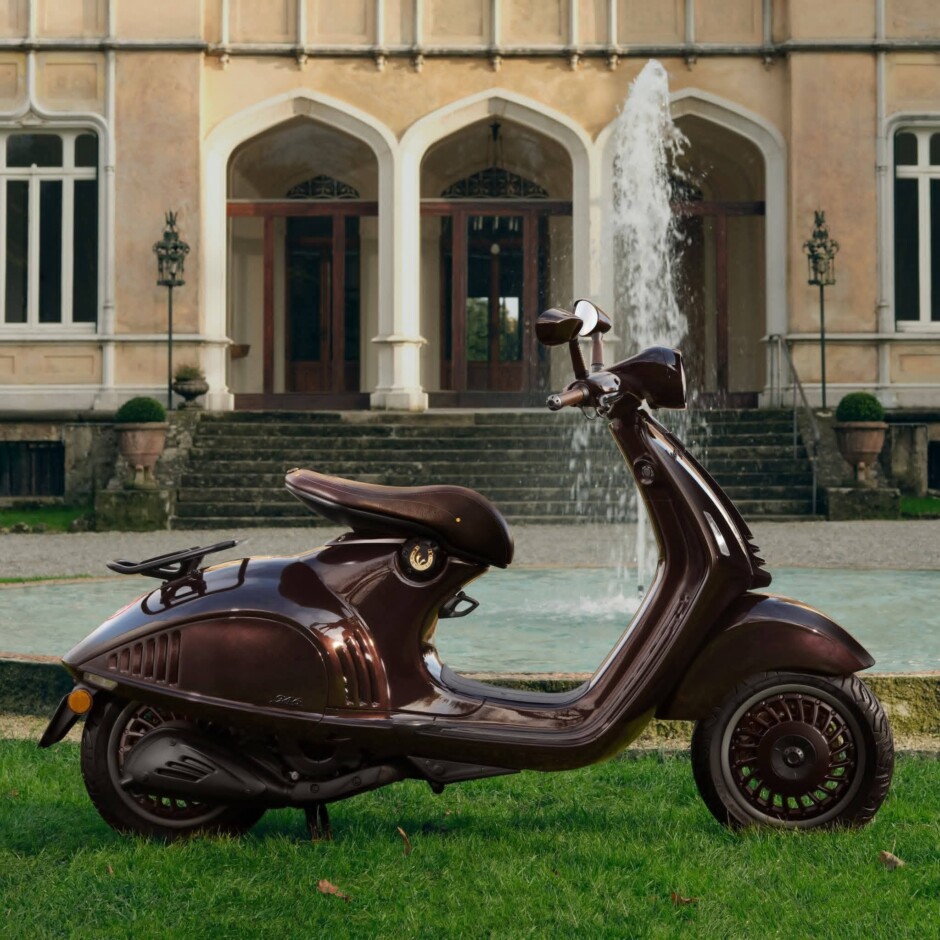 La livrea marrone profondo metallizzato, calda ed evocativa, richiama la terra e la stabilità. Le superfici alternano finiture opache e lucide, mentre i dettagli dorati — discreti ma decisi — impreziosiscono ogni elemento: dalla sella ai particolari meccanici.